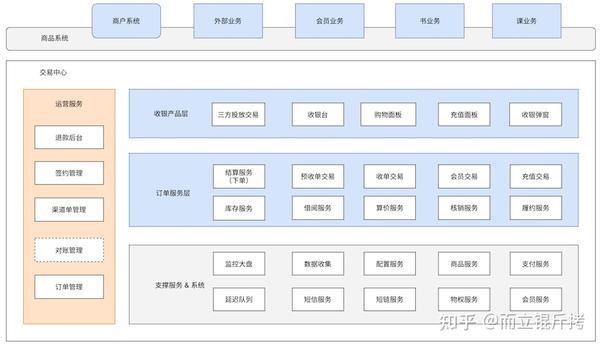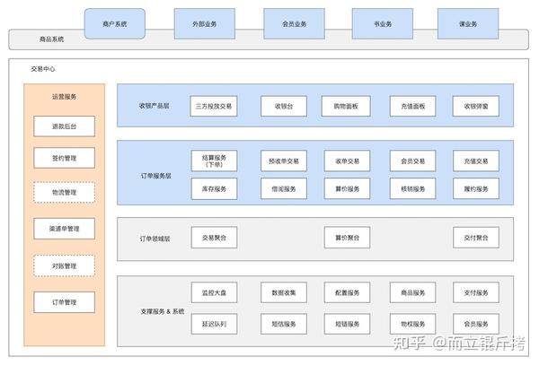 订单系统主要承载知乎站内站外的各种交易服务,提供稳定可靠的交易场景支撑。主要分为以下几个部分: