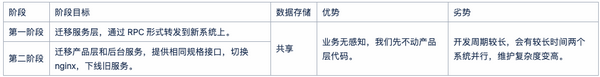 第一阶段是迁移逻辑,即将客户端发起的 HTTP 请求转发到 RPC 接口,再由新系统执行。第一阶段做到所有的新功能需求都在新系统上开发,旧系统只需要日常维护。