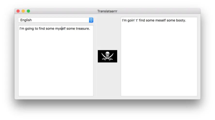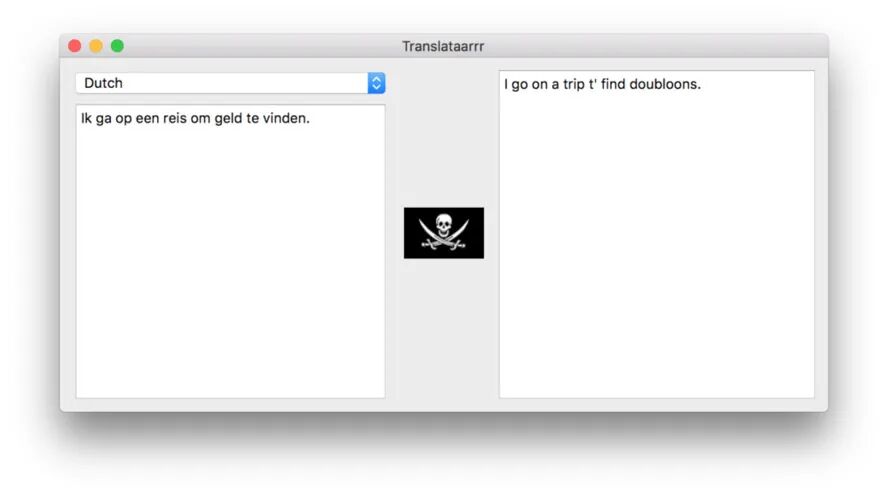 从任何语言翻译(谷歌翻译支持)到海盗语。它调用了远程api http://api.funteransations.com 将英语翻译成海盗语,以及谷歌的一个非官方的Python包装器将其他语言翻译成英语。