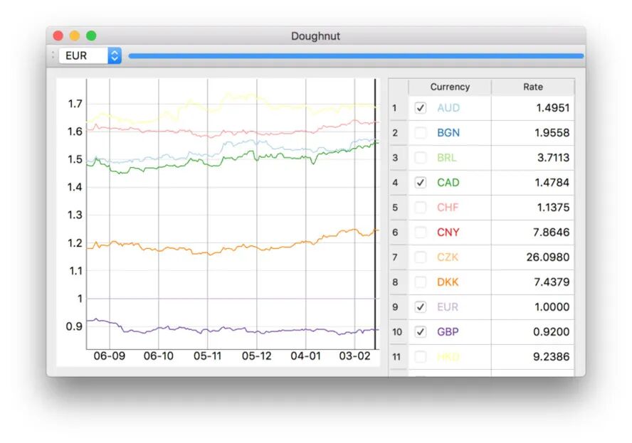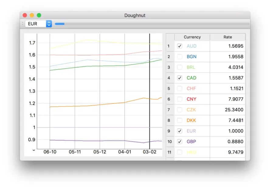 它会逐步加载数据,分辨率不断提高。给定日期的汇率显示在右侧面板中,并根据鼠标位置进行更新。