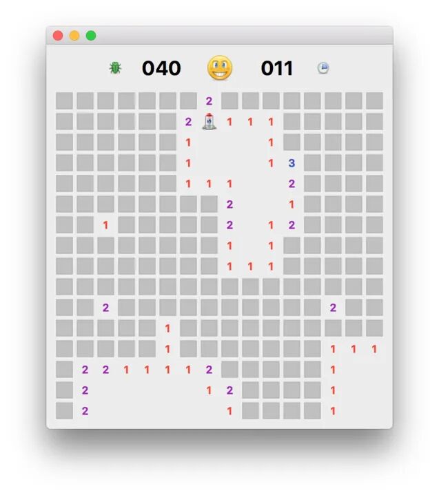 在许多扫雷的变种中,初始回合被认为是一个自由回合:如果你在第一次点击时击中一枚地雷,它会被移动到其他地方。这里我们投机取巧了一点,让第一次尝试确保它是在一个非地雷的地点。这使我们不必担心第一步走得不好导致需要我们重新计算相邻。我们把它解释为“围绕火箭的初步探索”,让它听起来挺合理的。
