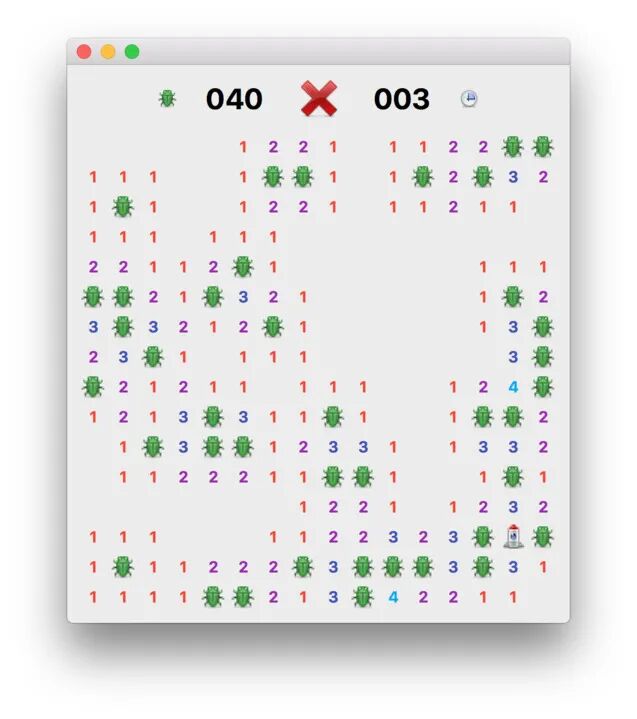 这是一个简单的单人探索游戏,模仿扫雷船,你必须在不触及隐藏的地雷的情况下揭示所有的小方块。这个小方块实现是使用定制的QWidget对象,这些对象分别将它们的状态保存为mine、status和相邻的mine计数。在这个版本中,地雷被外星虫子(Bug)取代,它们也可能是其他任何东西。