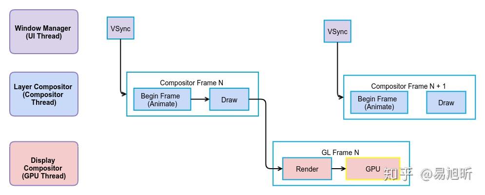 Display Compositor 则比较简单,它持有一个 Compositor Frame 的队列不断的进行取出和绘制,输出的频率唯二地取决于 Compositor Frame 的输入频率和自身绘制 GL Frame 的耗时。基本上可以认为 Layer Compositor 和 Display Compositor 是生产者和消费者的关系。