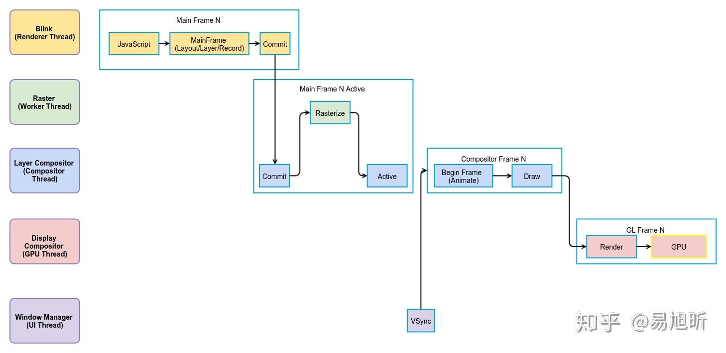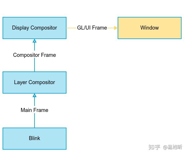 所有的渲染流水线都会有帧的概念,帧这个概念抽象描述了渲染流水线下级模块往上级模块输出的绘制内容相关数据的封装。我们可以看到 Blink 输出 Main Frame 给 Layer Compositor,Layer Compositor 输出 Compositor Frame 给 Display Compositor,Display Compositor 输出 GL Frame 给 Window。我们觉得一个动画是否流畅,最终取决于 GL Frame 的帧率(也就是目标窗口的绘制更新频率),而觉得一个触屏操作是否响应即时,取决于从 Blink 处理事件到 Window 更新的整个过程的耗时(理论上应该还要加上事件从 Browser 发送给 Compositor,再发送给 Blink 的这个过程的耗时)。