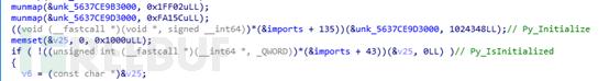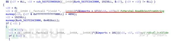 看到PyMarshal_ReadObjectFromString函数的时候,可以得知该样本使用脚本式来执行python的代码。