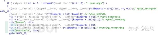 4. 之前已经将python api的地址存储在imports变量内,之后的调用也是通过imports变量来进行的,还原一下调用的python函数的符号,可以看到样本初始化python环境和执行的整个过程。