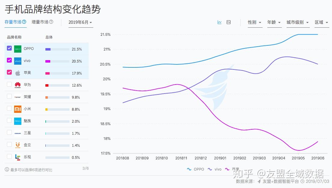 来源: 友盟+全域罗盘“手机品牌结构变化趋势”