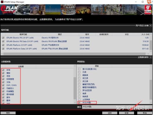6、在“用户自定义安装页面”有程序功能、主数据类型、界面语言三部分组成,我们在主数据类型有表格、宏、图片、配置、图框、模板、项目、权限管理、文档、DXF/DWG、功能定义、机械模型、部件数据、脚本、翻译、XML组成;主数据类型默认是全勾选。在程序功能中由于我是已安装许可证客户端所以前面两个未勾选((如图7所示))在界面语言选择中文(中国)后点击“安装”如图8所示。