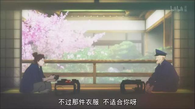 而制作方的用心着实令我惊叹,在很多显而易见与鲜为发现的小细节里都能给人一些惊喜。单说第一集,画面经常配以对比鲜明的亮眼色彩,从介绍人物时一闪而过的各色图案到超大号金色字体的人物名字,从鲜艳图案的彩绘纸门到信长花哨的红色披风,从大片粉色的樱云到漫山的绿草花田,血滴落水中的精彩特效,甚至是只出现了几秒钟的小翠鸟都配合光影呈现反射的蓝绿色……不得不说是视觉上的一大享受。仔细看的话,可以发现每当背景出现了屏风、墙、纸门甚至正式服饰等物品时,上边总有精致的和式风格图案,譬如院墙上的蓝色烟云图案,譬如归蝶服饰上的蝴蝶图案,譬如炫目夕阳映出的纸窗上的古木松石……用“精致”与“华丽”两词来形容也并不夸大。场景的还原算是Rotoscope的一大优点,而这一点在动画中得到了完美体现。
