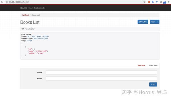 得益于DRF提供的api可视化界面,浏览器访问127.0.0.1:8000/api/books/,如果出现了以下界面并添加数据正常,则说明后端的基本逻辑已经ok了~下图为添加了一条数据之后的效果。