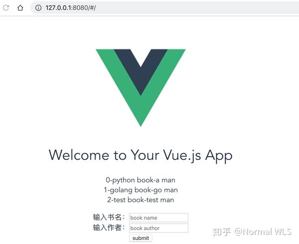 接下来的工作以appfront项目目录为根目录进行,开始写一点前端的展示和表单,希望达到两个目标,一是能从后端请求到所有的books列表,二是能往后端添加一条book数据。说白了就是希望把上面的页面用Vue简单实现一下,然后能达到相同的功能。对于Vue项目中各个文件的功能这里也不多解释,可以参考其文档系统学习。这里只需要知道欢迎页面中的样式是写在App.vue和components/HelloWorld.vue中即可。