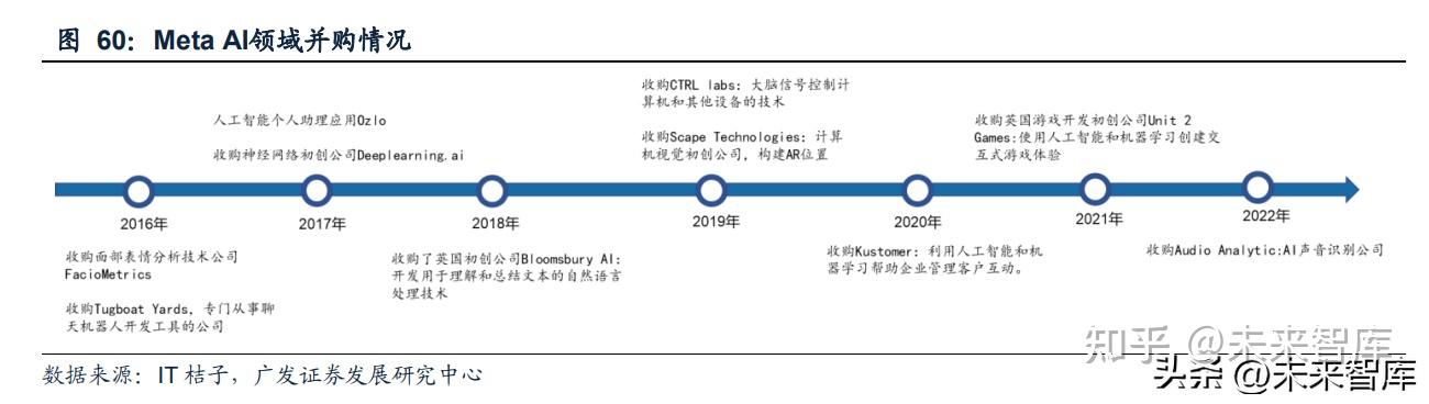 Meta在AI领域研发底蕴深厚,具有世界级话语权。由于社交平台在推荐算法、广告、 搜索排名、推荐以及用户数据分析等方面的需要,Meta很早便开始布局人工智能技 术。2013年4月成立人工智能研究机构FAIR,FAIR主要成就包括发布开源机器学习 框架PyTorch、自然语言处理模型PyText等等。同时,Meta在AI领域通过收购实现技 术拓展。2016年Meta收购面部表情分析技术公司FacioMetrics以及聊天机器人开发 工具的公司Tugboat Yards;2017年收购人工智能个人助理应用Ozlo和神经网络初 创公司Deeplearning.ai;2018年收购了开发用于理解和总结文本的自然语言处理技 术英国初创公司Bloomsbury AI:2019年收购开发大脑信号控制计算机技术的CTRL labs、收购计算机视觉初创公司Scape Technologies;2020年收购利用人工智能和 机器学习帮助企业管理客户互动的公司Kustomer;2021年收购使用人工智能和机器 学习创建交互式游戏体验的公司Unit 2 Games、收购AI声音识别公司Audio Analytic。 Meta在AI领域并购数量较多,持续在AI技术领域扩张,不断汲取优秀的技术人才。