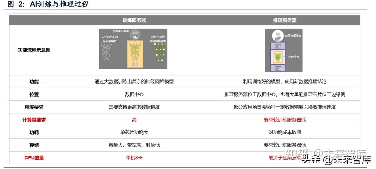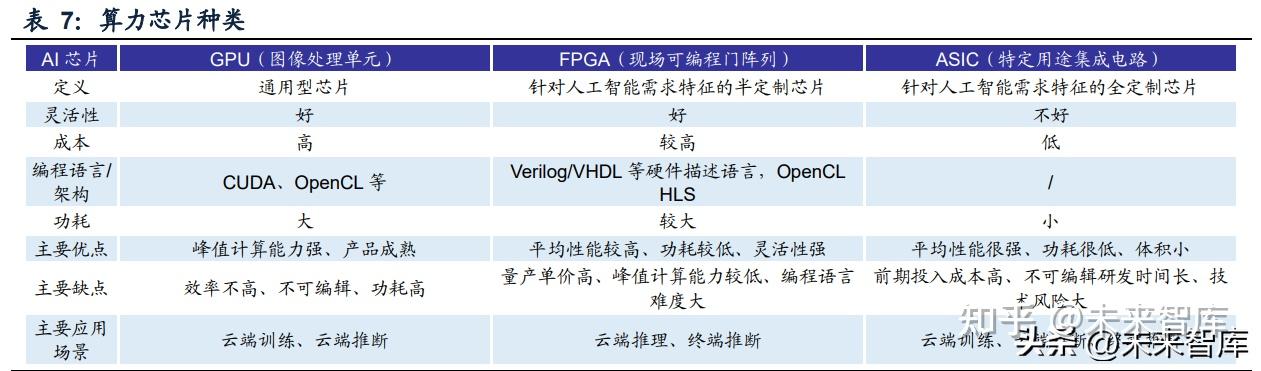 算力芯片是AI服务器中处理训练与推理的核心。在模型训练和推理的过程中需要大 量的计算,其本质是在网络互联层中将大矩阵输入数据和权重相乘,因此主要的计 算方式为矩阵计算。在矩阵计算中,每个计算都是独立于其他计算的,因此可以通 过并行计算的方法来对计算过程进行加速。由于算力芯片相比于CPU拥有更多独立 核心,因此深度学习和神经网络模型在算力芯片的加持下,采用高度并行的方式进 行计算,可更高效地完成计算任务。 从技术架构来看,算力芯片主要分为GPU、FPGA、ASIC三大类。其中,GPU是较 为成熟的通用型人工智能芯片,而FPGA和ASIC则是针对人工智能需求特征的半定 制和全定制芯片。