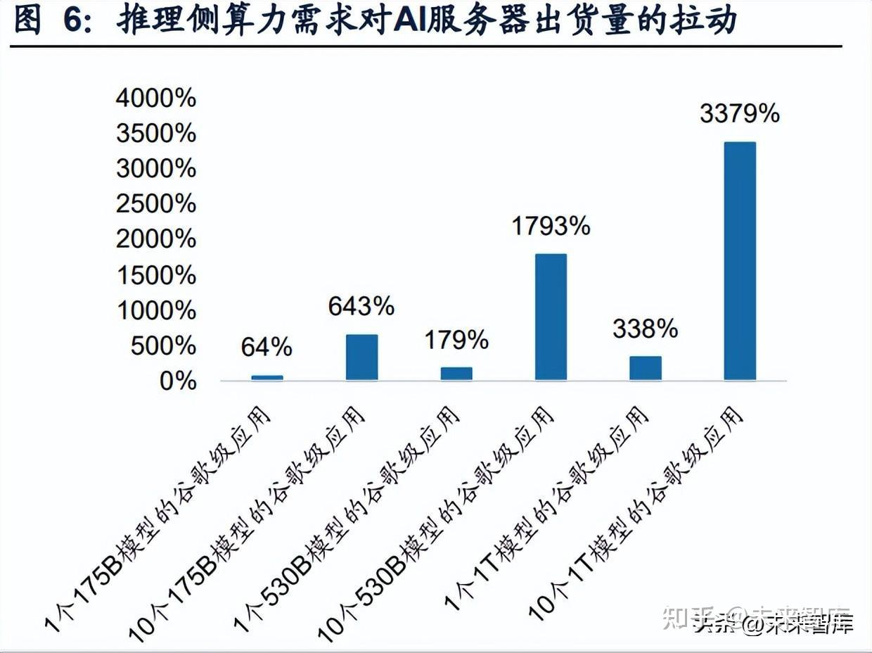 根据上文对训练&推理算力需求测算,并以Trend Force数据预估2022年搭载 GPGPU的AI服务器出货量14万台为基数,测算训练侧与推理侧AI服务器需求对服 务器出货量的拉动。100个175B训练模型对AI服务器出货量的拉动为9.6%,10个 使用GPT-3.5 175B模型的谷歌级推理应用对全球AI服务器出货量的拉动为643%。