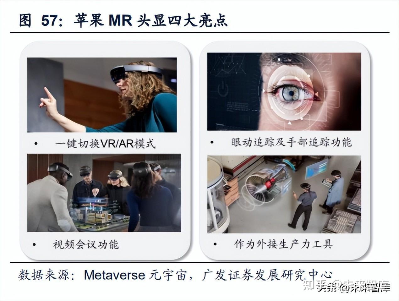 主攻教育、健康、游戏、视听四大应用场景,AppleTV+团队或成内容研发主 力。苹果围绕健康、教育、游戏、视听四大场景对其MR内容有所布局,例如开发有 助于冥想和锻炼的AR应用程序,让用户在看书的过程中体验到奇幻的环境与现实世 界融为一体的感受,让用户处于沙漠或者太空场景中观看视频,创建底层引擎为MR 游戏提供支持。根据Metaverse元宇宙,苹果的内容团队由一个代号为Z50的团队研 发,规模约为几十人,该团队成员多数都是来自视频、游戏等领域,其主要任务为根 据自身过去的流媒体服务Apple TV+中的经验,为MR头显打造内容。彭博社记者 Mark Gurman报道,苹果正在将自家常用的FaceTime、笔记等软件移植到头显当中, 另外它也可以充当Mac设备的“第二屏”。