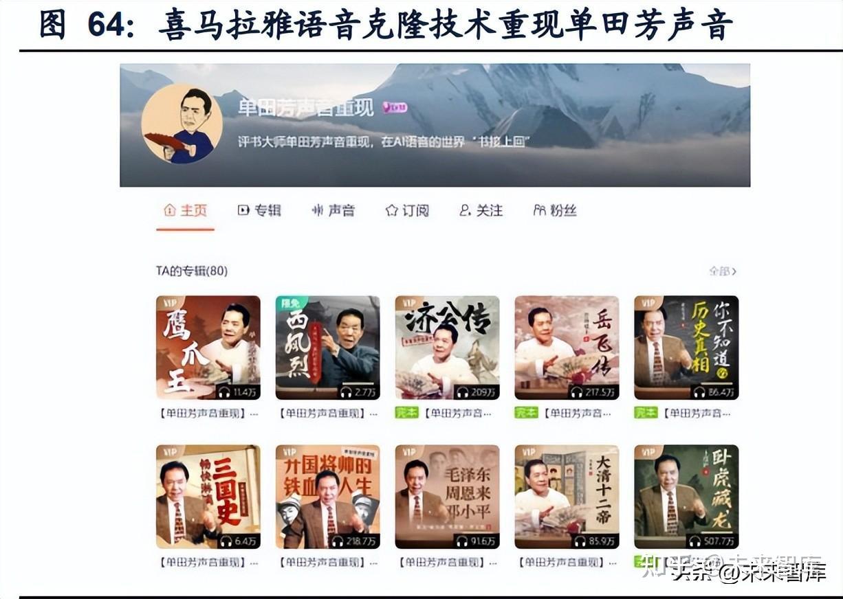 AIGC通过提取信息生成音频,TTS领域应用较为成熟。TTS即Text-to-speech,主要 是基于AI的自然语言处理+语音合成技术把文字转化为自然语音。TTS应用较为成熟, 国内外众多互联网巨头旗下产品均提供智能语音合成服务,例如Google Text-toSpeech、Amazon Polly、IBM Watson Text-to-Speech、喜马拉雅、字节跳动剪映 等等,广泛应用于客服、有声读物制作、语音播报、视频配音等领域。TTS技术的突 破点在于不断结合文本信息,通过语音语调、语音情感等提升对文本的表现力,以 及提升基于用户的个性化能力,AI模型能力不断提升使得TTS技术取得长足进步。此 外,语音克隆本质上是一种模仿目标声音音色、语调、语音习惯的TTS,契合声音IP 化的潮流,目前也正在配音、虚拟人、地图导航语音等方面得到广泛应用,例如喜马 拉雅运用TTS技术重现单田芳声音版《毛氏三兄弟》;标贝科技旗下恐龙贝克APP采 用AI语音合成技术,通过为孩子复刻父母亲声音;与奥飞娱乐合作将超级飞侠乐迪/ 小爱的声音定制成TTS声音等等,极大程度丰富用户体验。