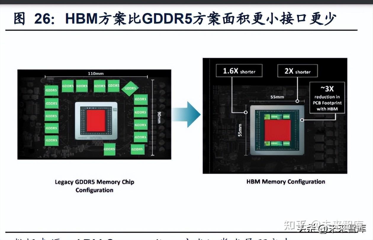 GPU主流存储方案目前主要分两种:(1)GDDR方案:该方案在SoC周围有大量外 设。该方案主要通过从GDDR5升级为GDDR6提高带宽,但GDDR如果要增加1 GB 的带宽将会带来更多的功耗,因此不利于系统性能提升。(2)HBM方案:HBM(全 称“3D High Bandwidth Memory”),是一种非常紧凑的内存技术,由多个芯片垂直 堆叠而成,每个芯片上都有多个内存通道。HBM可以在很小的物理空间内实现高容 量和高带宽的内存,有更多的带宽和更少的物理接口,而物理接口越少,功耗越低。同时还具有低延迟的特点,但相对而言,成本更高。HBM方案目前已演进为较为主 流的高性能计算领域扩展高带宽的方案。