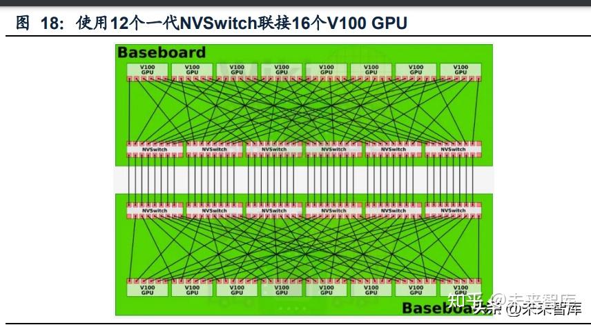 NVSwitch:实现服务器内更高带宽、更低延迟、更多GPU间通信。NVIDIA在2018 GTC大会发布了首款节点交换架构——第一代NVSwitch,其上有18个NVLink端口, 在单服务器节点内通过12个NVSwitch可以实现16个V100以NVLink能够达到的最高 速度进行多对多GPU通信;基于NVLink +NVSwitch实现服务器节点内16颗V100互 联的一台DGX-2与两台通过IB互联的DGX-1(每台内有8个V100)相比,前者AI运算 速度是后者的两倍以上。目前NVSwitch已经迭代到第三代,单芯片上共有64个第四 代NVLink端口,支持GPU间900GB/s的通信速度,这些通过NVLink Switch互联的 GPU可用作单个高性能加速器,拥有高达15petaFLOPS的深度学习计算性能。