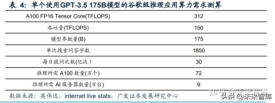 (2)AI大模型在推理阶段算力需求测算。 ChatGPT活跃用户数量迅速增加、BING搜索引擎开始接入ChatGPT、百度发布文 心一言并启动内测,以GPT为代表的大语言AI模型在文字推理/生成领域的应用加 速落地;此外,基于GPT的midjourney展现出较强的图片创作能力,Adobe也发布 了可生成图片、视频、声音等内容的模型Firefly,AI模型在多媒体领域的推理/生成 应用也在快速发展。考虑到AI模型在文字生成领域应用落地进展较快,我们对这一 部分推理算力需求进行测算,基于以下关键假设:①参考谷歌月均搜索次数,假设 一个谷歌级应用每日的搜索次数为30亿次;并假设30亿次问答在每日24小时中均 匀分布;②假设单次问答总字数为1850字。 由此测算,单个应用GPT-3.5 175B模型的谷歌级文字推理应用新增的NVIDIA A100需求空间为72万个,新增的AI服务器需求为9万台。