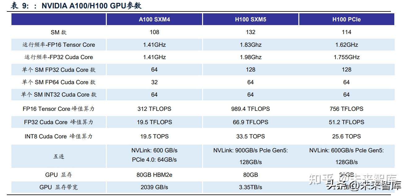 英伟达引领行业技术升级。NVIDIA是GPU的龙头企业,针对高性能计算,英伟达从 2016年开始,陆续推出了Pascal、Volta、Turing、Ampere、Hopper五个平台架构。 其GPGPU去掉或减弱了GPU的图形显示部分能力,将其余部分全部投入与图形处 理无关的通用计算。随着架构持续迭代升级,其算力芯片产品在支持的数据类型、 计算能力以及互联带宽等核心参数均有显著提升,对AIGC的发展起到了关键的推动 作用。 英伟达于2020年和2022年相继推出针对AI、数据分析和HPC应用场景的两款产品: A100和H100。与A100相比,H100的综合技术创新可以将大型语言模型的速度提高 30倍,从而提供业界领先的对话式AI功能。具体到性能参数,同为SXM外形规格的 H100/A100,半精度浮点算力(FP16 tensor core)分别为989.4/312TFLOPS,互连 带宽分别为900/600 GB/s。2023年GTC大会上,英伟达针对ChatGPT等大型语言模 型的大规模部署,推出了H100 NVL,其配备双GPU NVLink,将两张拥有94GB HBM3 显存的PCIe H100 GPU拼接在一起,可处理拥有1750亿参数的GPT-3大模型。与适 用于GPT-3的HGX A100相比,一台搭载四对H100和双NVLINK的标准服务器速度能 快10倍,可以将大语言模型的处理成本降低一个数量级。