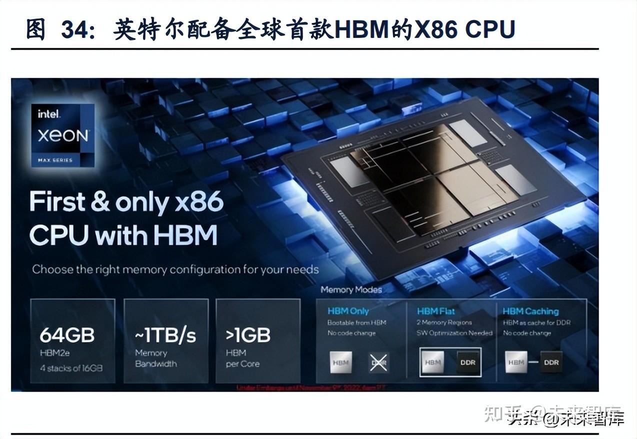 HBM的特性相比DDR更适合用于AI领域。HBM能够很好满足针对AI领域内存高带宽、 大容量、低功耗的需求,主要体现在:第一,HBM通过TSV和微凸块技术将3D垂直 堆叠的DRAM芯片相互连接,突破了现有的性能限制,大大提高了存储容量。第二, HBM具有可扩展更大容量的特性。HBM的单层DRAM芯片容量可扩展;HBM通过4 层、8层以至12层堆叠的DRAM芯片,可实现更大的存储容量;HBM可以通过SiP集 成多个HBM叠层DRAM芯片,从而实现更大的内存容量。第三,由于采用了TSV和 微凸块技术,DRAM裸片与处理器间实现了较短的信号传输路径以及较低的单引脚 I/O速度和I/O电压,使HBM具备更好的内存功耗能效特性。第四,在系统集成方面, HBM将原本在PCB板上的DDR内存颗粒和CPU芯片一起全部集成到SiP里,因此 HBM在节省产品空间方面也更具优势。 在云端高性能服务器领域,HBM已经成为了高端GPU的标配。英伟达从2017年发布 的V100起,一直配置最新的HBM技术,如A100使用了HBM2E,H100使用了SK海 力士的HBM3。