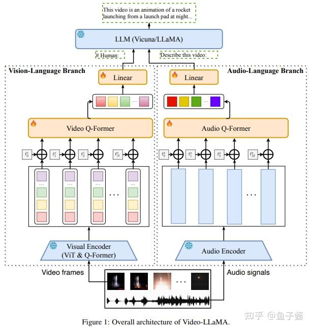 简述: 论文提出了一种多模态框架Video-LLaMA,可让大型语言模型理解视频中的视觉和听觉内容。该模型从冻结的预训练视觉和音频编码器以及冻结的LLMs开始进行跨模态训练,解决了捕捉视觉场景中的时间变化和整合视听信号两个挑战。作者还提出了一个Video Q-former来将预训练的图像编码器组装到视频编码器中,并引入了一个视频到文本生成任务来学习视频-语言对应关系。
