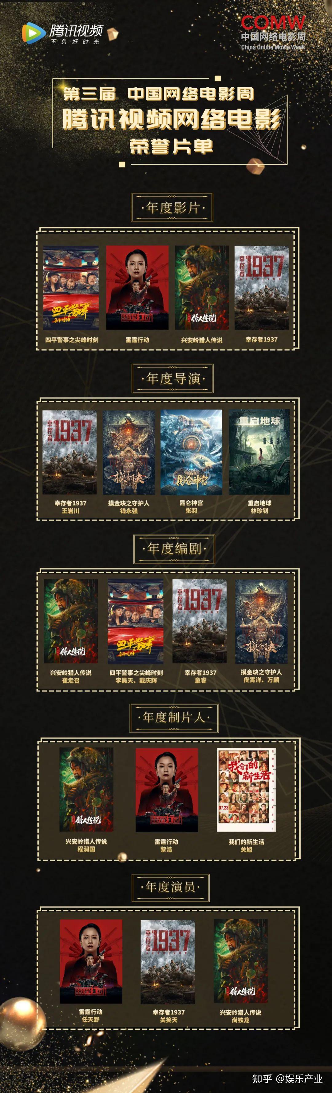 《兴安岭猎人传说》以年度影片、年度编剧、年度制片人、年度演员4项荣誉成最大赢家,《幸存者1937》也摘得4项大奖。自制项目《四平警事之尖峰时刻》《雷霆行动》《昆仑神宫》《摸金玦之守护人》均摘得多项荣誉。