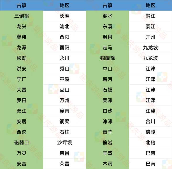 从地理位置分布上来看,好耍的古镇大部分都位于重庆市的中部和西南部,而其余地区的分布则较少。具体名单如下: