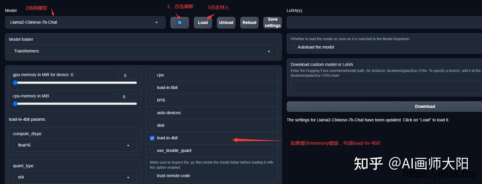 将Llama2-Chinese-7b-Chat.7z压缩文件下载到本地放入models文件夹内,解压文件,然后在浏览器地址栏里打开 http:// 127.0.0.1:7860/ ,点击页面顶部model选项卡,点击model后面刷新按钮,点击下拉列表选择模型,点击load按钮载入模型,如果出现提示memory相关错误就是爆显存了,可勾选load-in-4bit重新点击load按钮,提示“Successfully loaded Llama2-Chinese-7b-Chat”即表示模型导入成功,可点击顶部chat选项卡进行俩天对话。在input里输入提问内容,然后点击generate按钮发送。