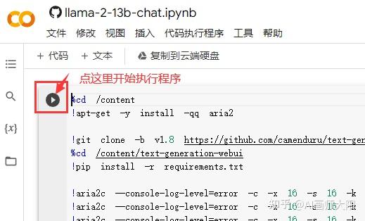 github项目地址: https:// github.com/camenduru/te xt-generation-webui-colab ,如果是Google colab免费用户的话,建议使用7b版本,再大的话可能会有错误,