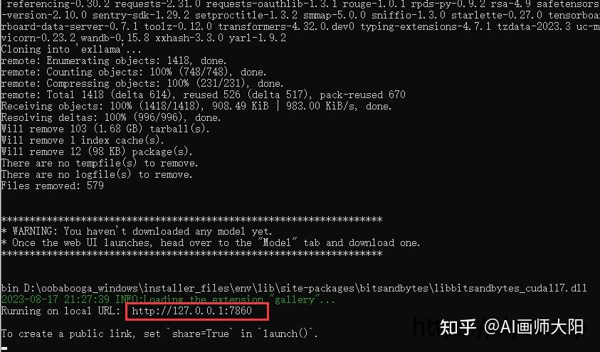 如果你中间遇到错误无法自动完成安装可能就是你的网络连接问题,可开启全局科学上网解决,成功安装完成后会输出一个访问地址: http:// 127.0.0.1:7860/ ,