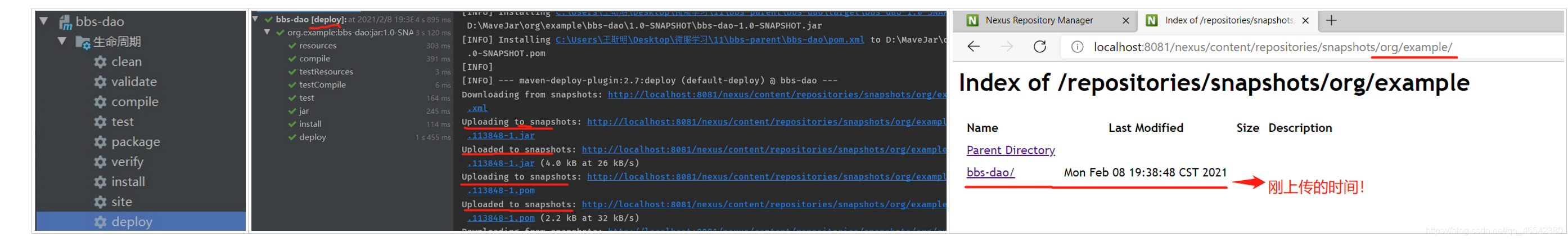 可以看到控制台。出现uploding 上传的提示:且可以在连接上查看到刚刚上传的模块. 当然本地仓库也是存在的!