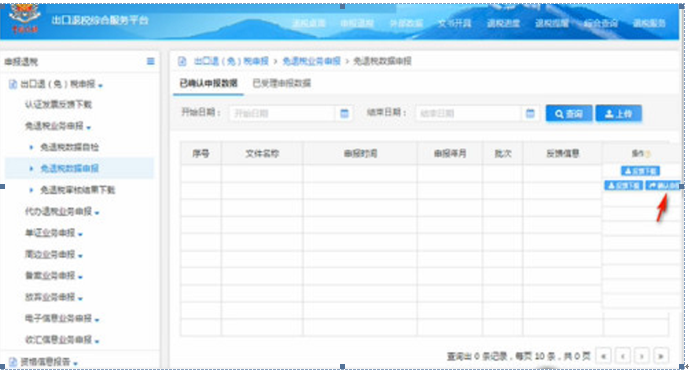 4、确认免退税明细数据 检查无误后,进行明细数据的确认。在退税向导第四步“确认免退税明细数据” 确认明细申报数据。核对下所属期是否正确,无误后点击确定。会弹出申报数据列表,显示确认的明细数据条数。确定后提示确认明细申报数据成功。