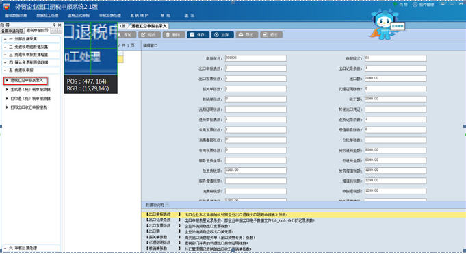 5、免退税申报 进入退税向导 免退税申报 退税汇总申报表录入,点击增加按钮,敲回车键,自动带出退税汇总表数据,点击保存。