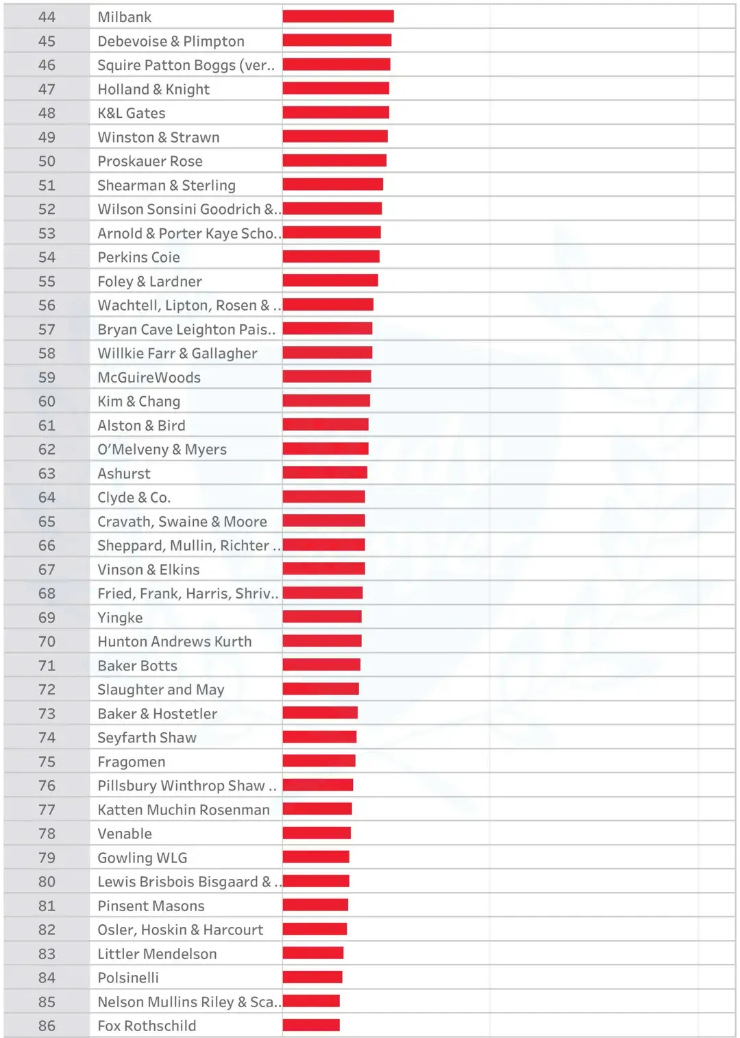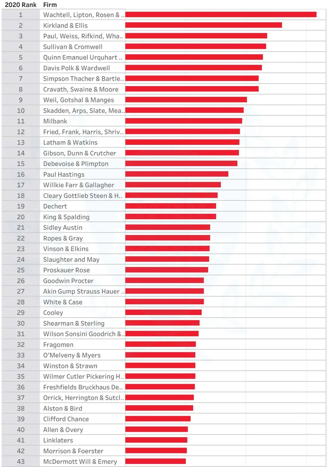 以下排名中,美国律所的数据取自Am Law 100,其他律所的数据则为Global 200调查所得。