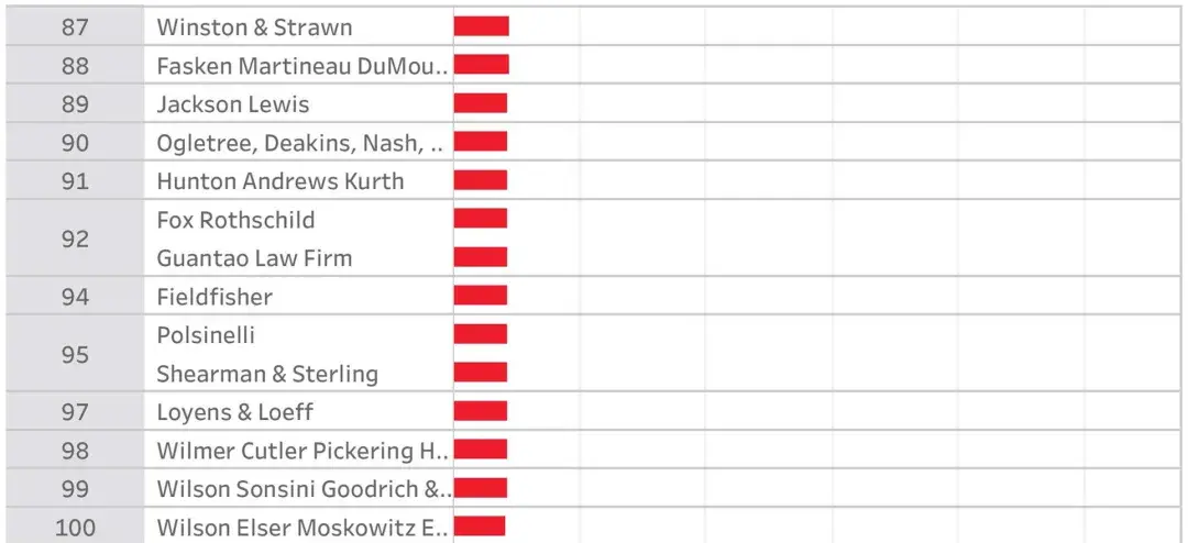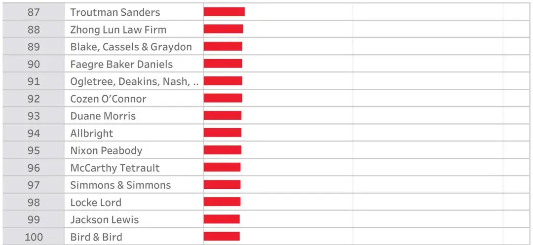 以下是2019财年营收排名全球前100位的律所榜单: