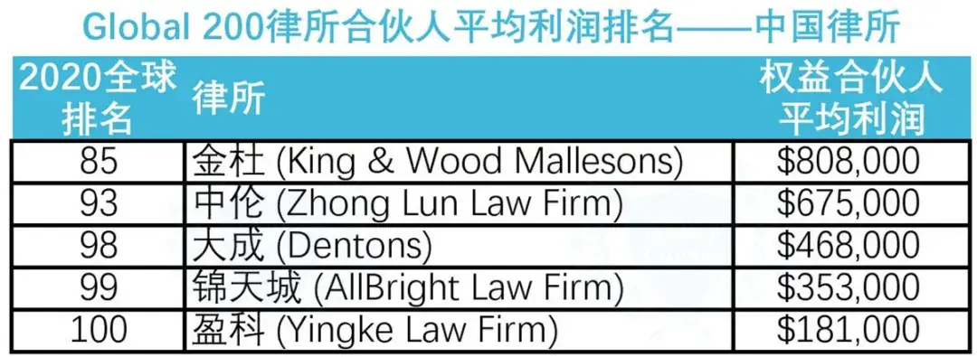 中伦律师事务所 (Zhong Lun Law Firm)排在全球第88位,2019财年营收约为5.35亿美元,律师人均创收34.4万美元。