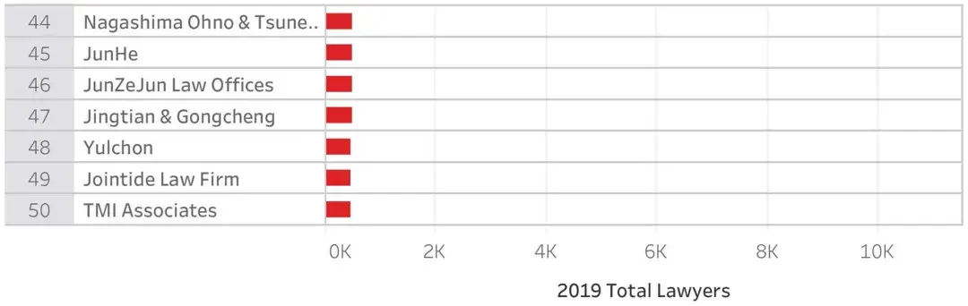 再来关注亚太地区,该地区规模最大的50家律所在全球共拥有73,373名律师,比2018年增长了22%之多。