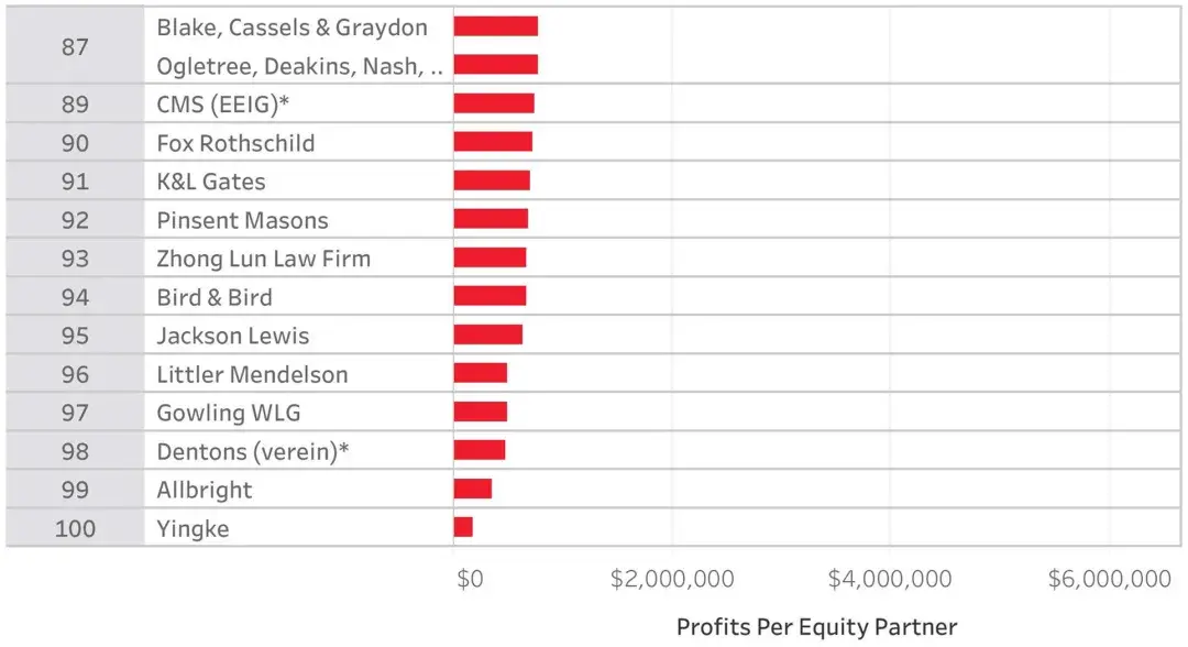 在2019年, Global 100律所的权益合伙人人均利润(PEP:Profit per Equity Partner)超过172.3万美元,比2018年小幅上升0.4%。 共有75家律所的PEP达到或者超过了一百万美元,比去年增加两所。英国律所Slaughter and May是排名最高的非美国律所,位列全球第24位。