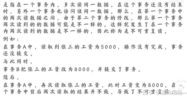 如A第一次读到的数据为100,此时B将其修改为200,A再次读数据,数据为200,两次数据不一致。