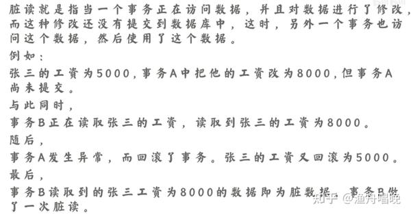 2.1、脏读( 读到了还没提交的数据,比如数据为100,此时A将其改为200,此时B去读数据,发现其为200,然后A进行了回滚,数据仍为100,脏读就是读到了不正确的数据 )