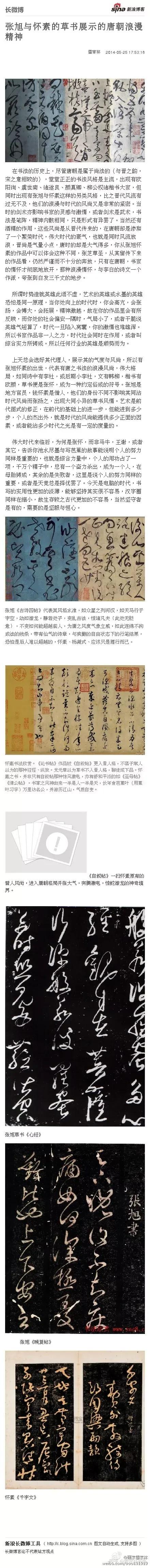 在书法的历史上,尽管唐朝是属于尚法的(与晋之韵,宋之意相较的),堂堂正正的书法风格是主流,出现有欧阳询、虞世南、褚遂良、颜真卿、柳公权诸楷书大家,但同时出现有张旭与怀素这样的另类风格,比之晋代风流有过无不及,他们的浪漫与时代的风尚又是非常的紧密。当时的剑术亦影响书家的灵感与激情,或者剑术是武术,书法是笔阵,精神内骸相同,只是形式有异罢了。当然还有酒精的作用,这些风尚是从晋代传来的,在唐朝却是渗和了一个繁荣时代,伟大时代的豪气,也就是同是风流放浪,晋尚是气量小点,唐时的却是大气得多,你从张旭怀素的作品中可以体会这种不同,张芝草圣,从其留传下来的作品看,仍然严谨而不十分的奔放,只有在唐朝,书家的情怀才彻底地放开,那种浪漫情怀,与李白的诗文一个作派,夸张到白发三千丈的地步。
