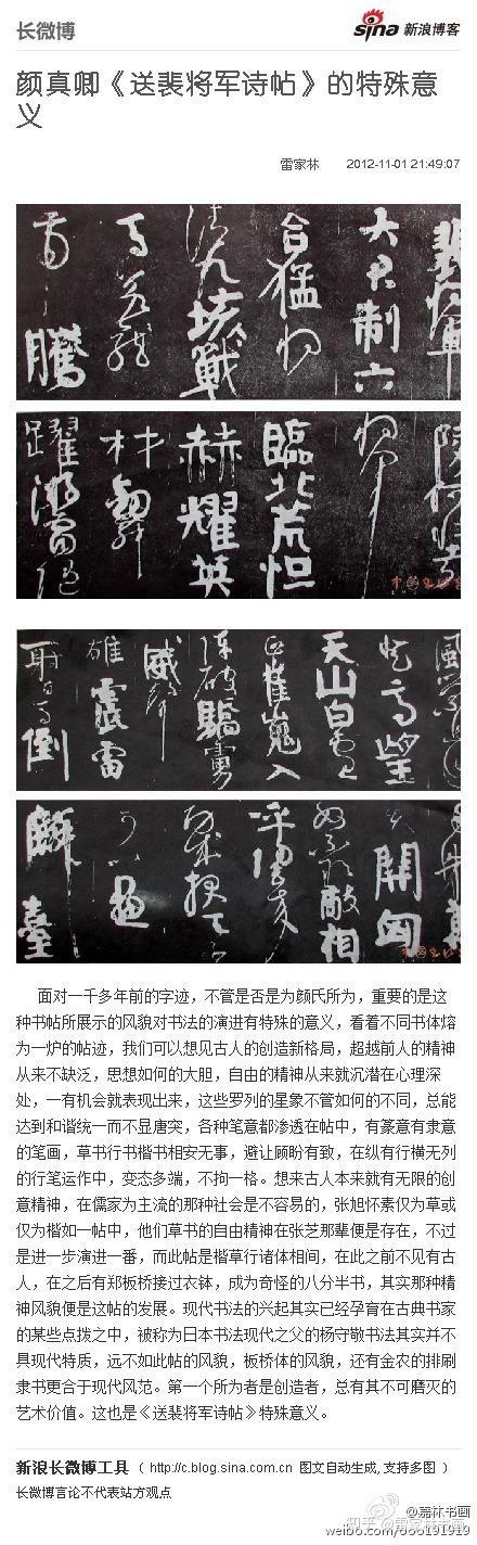 面对一千多年前的字迹,不管是否是为颜氏所为,重要的是这种书帖所展示的风貌对书法的演进有特殊的意义,看着不同书体熔为一炉的帖迹,我们可以想见古人的创造新格局,超越前人的精神从来不缺泛,思想如何的大胆,自由的精神从来就沉潜在心理深处,一有机会就表现出来,这些罗列的星象不管如何的不同,总能达到和谐统一而不显唐突,各种笔意都渗透在帖中,有篆意有隶意的笔画,草书行书楷书相安无事,避让顾盼有致,在纵有行横无列的行笔运作中,变态多端,不拘一格。想来古人本来就有无限的创意精神,在儒家为主流的那种社会是不容易的,张旭怀素仅为草或仅为楷如一帖中,他们草书的自由精神在张芝那辈便是存在,不过是进一步演进一番,而此帖是楷草行诸体相间,在此之前不见有古人,在之后有郑板桥接过衣钵,成为奇怪的六分半书,其实那种精神风貌便是这帖的发展。现代书法的兴起其实已经孕育在古典书家的某些点拨之中,被称为日本书法现代之父的杨守敬书法其实并不具现代特质,远不如此帖的风貌,板桥体的风貌,还有金农的排刷隶书更合于现代风范。第一个所为者是创造者,总有其不可磨灭的艺术价值。这也是《送裴将军诗帖》特殊意义。