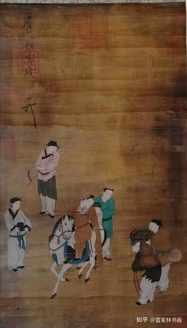 显然胡姬对于李白的温柔乡的感觉与酒的麻醉同等的重要,若在都市,有胡姬的青楼,自然少不得李白的身影,当然酒瘾过后,总得归到临时居所的时候,这个场景,便被周文矩绘进他的作品中,这幅《李白携琴醉归图》(三醉图之一,另二醉图将延后述之),绘李白骑在他的白马上,好几位仆人簇拥,一位携琴,一位负葫芦之酒,一位举鼎,其身腰系扇,一位持帽,另两位随马后扶持。主人醉的不成样时,早已不省人事,昏昏入睡,不是那班童子仆人扶持,恐怕早已滑下马来,此时的李白,还在醉梦中,回味他与胡姬相聚的快乐春宵吧,然而相聚之后终有散,也只落得春宵一梦寒。看那个阵势,李白被明皇弄了个翰林的官当当,官虽小也算个领导了,自然侍候他的人多一点,不象在野时独自一人的行走,琴与剑皆不可少,琴交友,剑防身,绿水青山随意游,虽然潇洒却未能济苍生,所以终究流入长安名利地,寻找他的机会。