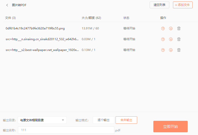 2、上传文件,选择输出格式为【合并输出】,设置文件名,点击立即开始,稍等几秒就能合并完成。