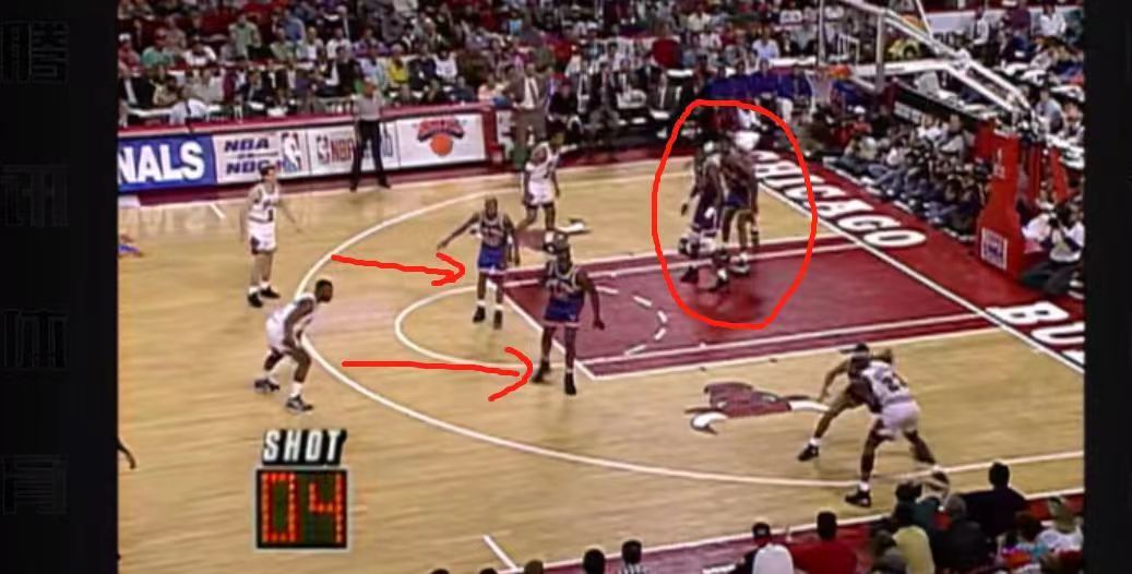 在93年东决对阵尼克斯时是最典型的,公牛上线两名拉开空间的射手待遇是防守球员放了大概2,3步的距离,防守人站位几乎是贴近罚球线, 你是持球手,队友站外线全是追梦,心态能不崩吗? 那时 三分射手投的都是空位定点篮, 皮蓬那时三分命中率不足三成,格兰特,卡特莱特不足为惧,所以 尼克斯篮下时时刻刻蹲了两个人, 公牛也尝试过所有人堆到一侧, 做出伪清空一侧的战术让乔丹单打, 但差别不过就是篮下多堆了几个人,中距离稍微干净了些