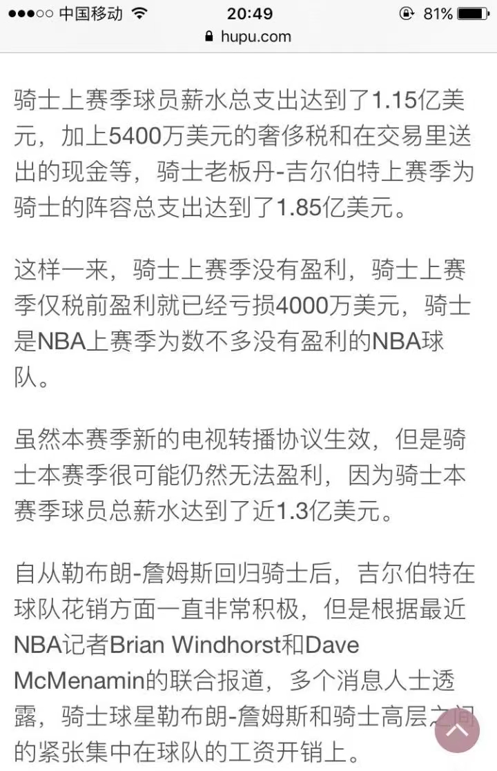 视而不见,继而另立靶子:骑士市值上涨,队史总冠军之类的,先不说你那个总冠军有多黑,詹姆斯到底爱不爱骑士(跑两次,威逼管理层...)等等,我就只放一张图: