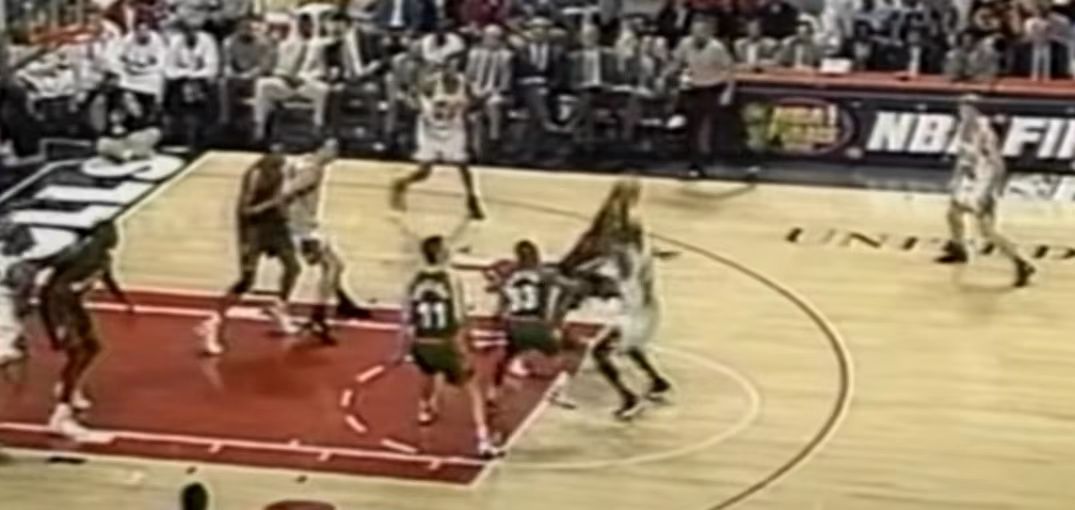 只有96年总决赛表现神勇,抢下很多前场板, 这主要是因为超音速对乔丹实行丧心病狂地包夹战略,我们就举例96和超音速比赛的第二场: