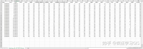 而记录有北京市 部分PM2.5浓度监测站点 在2019年05月18日00时至23时(其中不含19时)等 23个逐小时PM2.5浓度数据 的 Excel 表格文件则如下所示,其中包括各站点在23个整点时所监测到的 PM2.5 浓度。