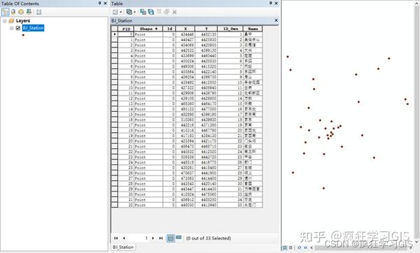 其中,该矢量图层还包括属性表,属性表内容包括每一个站点的编号、地理位置与中文名称,如下图所示。